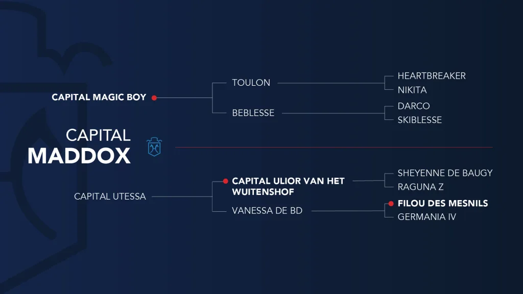 By Capital Magic Boy out of Capital Utessa, this young chestnut mare represents a tightly held Capital family line. Her dam is also the mother of Capital Rouge, and her granddam, Vanessa de BD (by Filou des Mesnils), is known for producing athletic, bold offspring. Capital Maddox is a lovely modern type with uphill movement and natural impulsion.