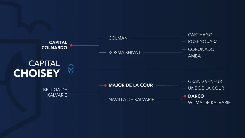 A key Capital mare, Choisey is the dam of Horizon and Romney and comes from one of the most respected damlines in the studbook. Her dam, Beluga de Kalvarie, also produced Der Senaat III, who jumped at 1.60m, and the granddam traces to Darco  – a guaranteed source of power and grit.